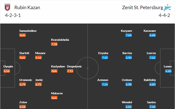 Đội hình dự kiến Rubin Kazan vs Zenit