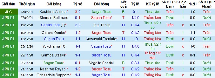 + Thống kê 10 trận gần nhất của Sagan Tosu