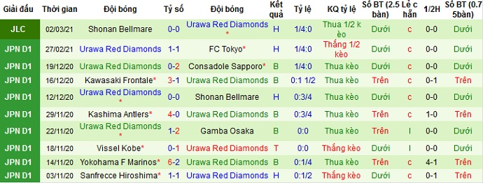 + Thống kê 10 trận gần nhất của Urawa Red Diamonds