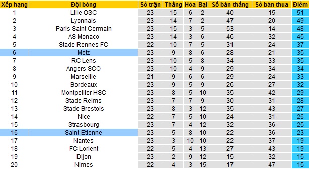Trong khi đó Metz hiện đã vươn lên vị trí thứ 7 của bảng xếp hạng với 35 điểm sau 23 vòng đấu. Khoảng cách giữa Metz với các đội có suất dự cúp châu Âu hiện chỉ còn là 3 điểm nhưng đội bóng vẫn đang kém đội đầu bảng Lille tới 16 điểm.