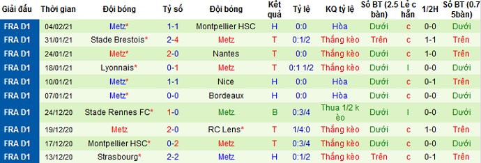 + Thống kê 10 trận gần nhất của Metz