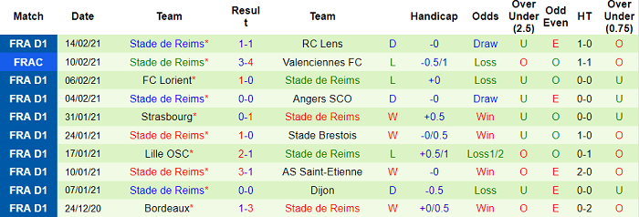 Reims là một trong 5 đội có tỷ lệ thắng kèo tệ nhất Ligue 1 mùa 2020/21. Tỷ lệ thắng kèo của Reims tại Ligue 1 mùa này chỉ ở mức 44.00%. Lựa chọn Reims vì thế không hứa hẹn mang tới sự an toàn cho giới đầu tư.
