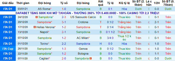 - Thống kê 10 trận gần nhất của Sampdoria