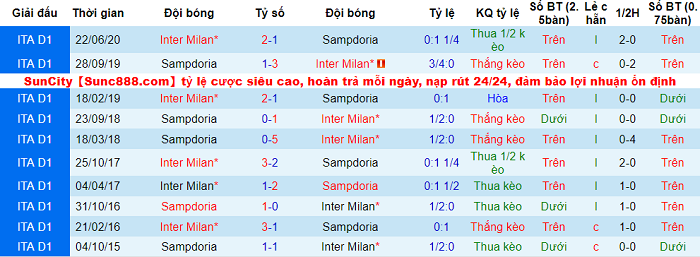 6/8 trận vừa qua thuộc khuôn khổ Serie A, Inter Milan đánh bại các đối thủ của mình với cách biệt từ 2 bàn trở lên. Vì vậy, Nerazzurri hứa hẹn vượt qua tỷ lệ chấp 1:0 trước Sampdoria.