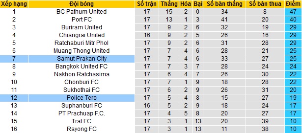 Bảng xếp hạng giải VĐQG Thái Lan trước vòng 18