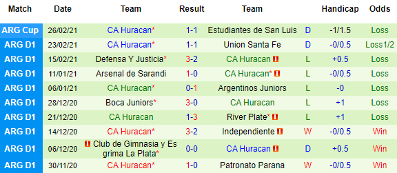 + Thống kê 10 trận gần nhất của Huracan