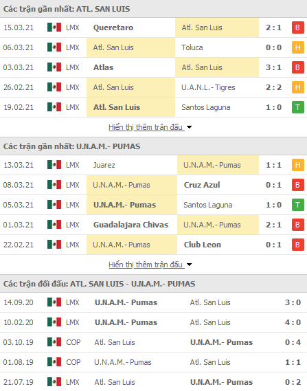 Phong độ và thống kê đối đầu gần đây San Luis vs UNAM Pumas: