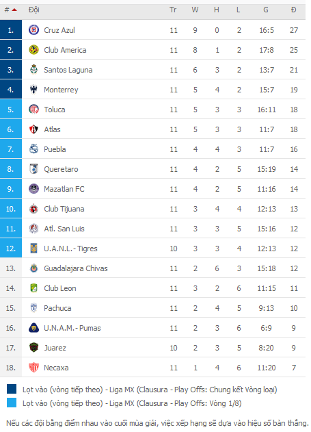 BẢNG XẾP HẠNG VĐQG Mexico
