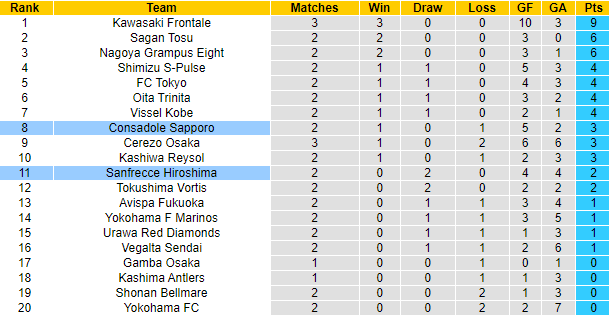 Consadole Sapporo chưa bao giờ là đối thủ dễ bị bắt nạt với Sanfrecce Hiroshima. Trong vòng 5 lần chạm trán Sanfrecce Hiroshima gần đây, Consadole Sapporo bất bại 4 lần với 2 chiến thắng và 2 trận hòa. 2 lần gần đây làm khách của Sanfrecce Hiroshima, Consadole Sapporo đều có được kết quả hòa. Lần tái đấu sắp tới, đội khách tiếp tục được tin tưởng vào khả năng giành kết quả thuận lợi.