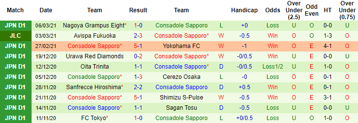 + Thống kê 10 trận gần nhất của Consadole Sapporo