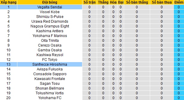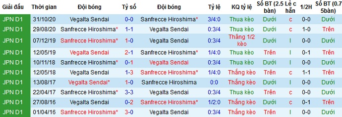 + Lịch sử đối đầu Sanfrecce Hiroshima vs Vegalta Sendai