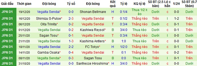 + Thống kê 10 trận gần nhất của Vegalta Sendai
