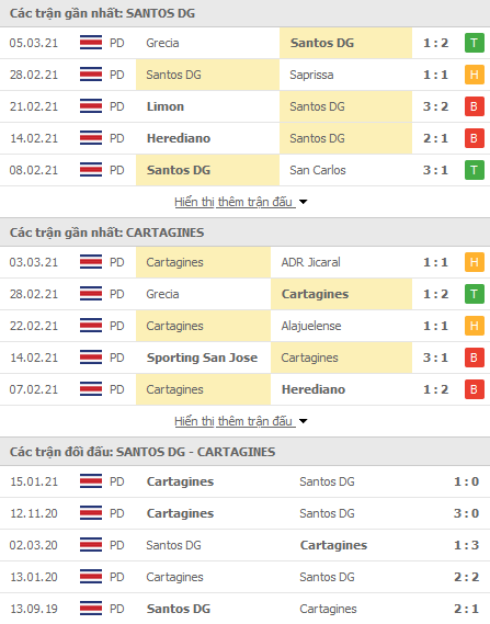 Phong độ và thống kê đối đầu gần đây Santos Guapiles vs Cartagines:
