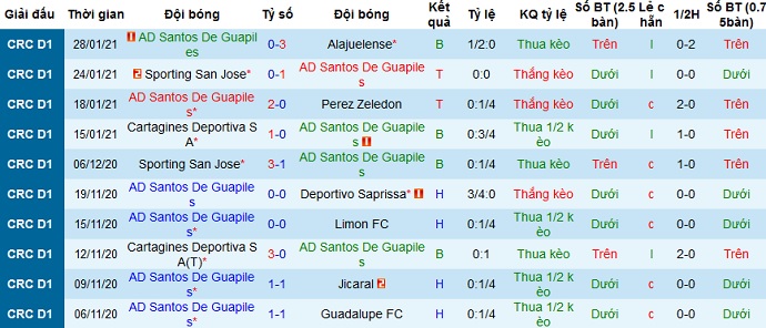 Trong 5 trận gần nhất tính cả giải đoạn lượt đ, Santos Guápiles thắng được 2 trận và để thua 3 trận. Trên sân nhà sau 3 trận hòa liên tiếp, Santos Guápiles có được 1 trận thắng và 1 trận thua ở các trận gần đây.