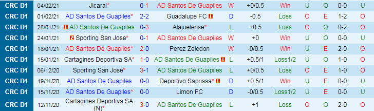 + Thống kê 10 trận gần nhất của Santos Guapiles