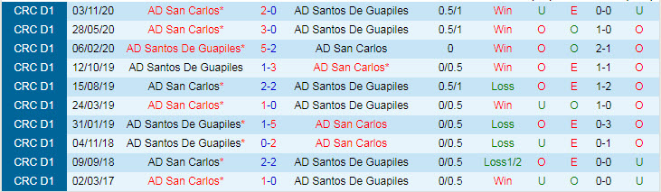 + Lịch sử đối đầu Santos Guapiles vs San Carlos