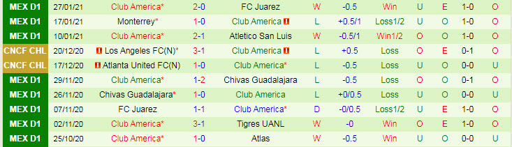 + Thống kê 10 trận gần nhất của Club America