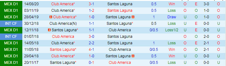 Phong độ và thống kê đối đầu Santos Laguna - Club America gần đây: