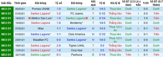 Tuy nhiên phong độ gần đây của Santos Laguna vẫn không thật sự ổn định. Ở 5 trận đấu gần nhất đội bóng có được 2 trận thắng, 1 trận hòa và để thua 2 trận. Thế nhưng thành tích sân nhà của Santos Laguna vẫn đang rất tốt khi thắng 4 và chỉ hòa 1 ở 5 trận gần nhất tại đây.