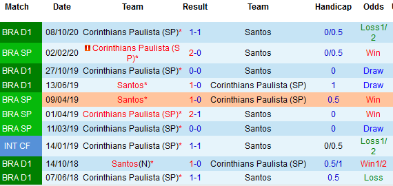 Kể từ tháng 9 năm 2017 đến nay, chưa có đội khách nào giành chiến thắng trong các lần đụng độ giữa 2 đội. Tính riêng với Corinthians, lần gần nhất họ được ca khúc khải hoàn trên sân Santos đã diễn ra từ năm 2014.