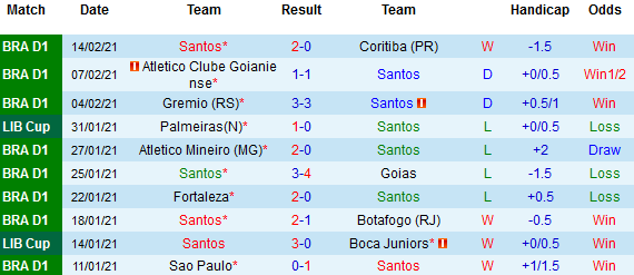 + Soi tỷ lệ kèo châu Á: Santos đang là địa chỉ đầu tư đáng tin cậy dành cho giới mộ điệu với 8 trong 11trận gần nhất đều vượt qua tỷ lệ.