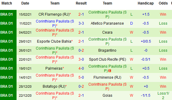 + Thống kê 10 trận gần nhất của Corinthians