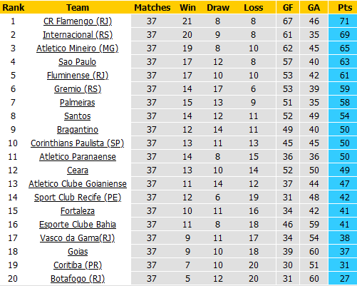 BẢNG XẾP HẠNG VĐQG Brazil