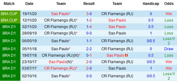 + Soi tỷ lệ kèo châu Á: Sao Paulo trượt dốc không phanh ở giai đoạn nước rút của mùa giải khi thua kèo tới 10 trong 11 trận gần nhất ở mọi giải đấu mà họ tham dự. Trong khi đó, Flamengo vừa đáp ứng sự kỳ vọng của giới đầu tư với 6 trong 9 trận gần nhất giành chiến thắng.