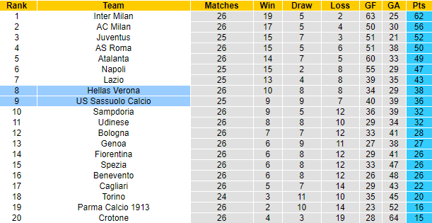 3 trận liên tiếp gần đây Sassuolo không biết đến mùi chiến thắng. Trên sân nhà, Sassuolo chỉ hòa và thua 5 trận liên tiếp gần đây. Trong khi đó phía đối diện, Verona thể hiện phong độ khởi sắc bằng việc bất bại 4 trên 5 vòng đấu vừa qua tại giải VĐQG Italia (thắng 2, hòa 2).