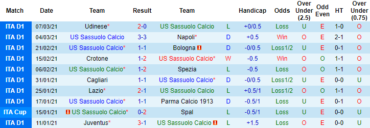 + Thống kê 10 trận gần nhất của Sassuolo