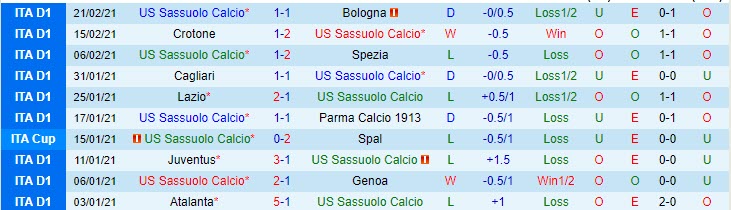 + Thống kê 10 trận gần nhất của Sassuolo