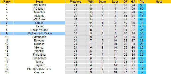 Phong độ và thống kê đối đầu Sassuolo - Napoli gần đây: