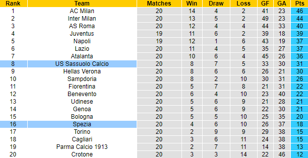 Sassuolo toàn thắng cả 5 trận đối đầu Spezia trước đây tính trên mọi đấu trường. Trong 5 trận đấu đó Sassuolo ghi 12 bàn và chỉ 3 lần để thủng lưới. Trên bảng xếp hạng Serie A 2020/21, Sassuolo đang xếp thứ 8 với 31 điểm sau 20 trận, trong khi đó Spezia xép thứ 16 với 18 điểm. Mọi thứ đều cho thấy Sassuolo vượt trội so với Spezia.