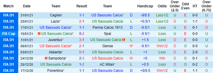 + Thống kê 10 trận gần nhất của Sassuolo