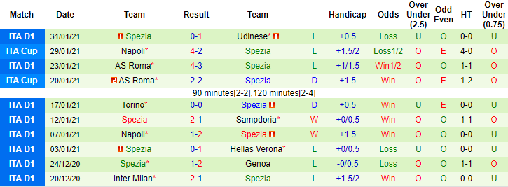 + Soi tỷ lệ kèo tài xỉu: 9 trên 10 trận sân khách gần đây của Spezia khép lại với tối thiểu 3 bàn/trận. Dù luôn ở thế chiếu dưới nhưng Spezia vẫn sẵn sàng chơi đôi công trước mọi đối thủ. Chọn: Tài.