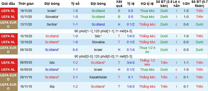 Trong 5 trận đấu gần đây Scotland có được 3 trận thắng nhưng đang để thua ở cả 2 trận gần nhất trước Slovakia và Israel với cùng tỷ số 0-1. Tuy nhiên trên sân nhà Scotland đang bất bại ở 6 trận gần nhất trong đó giành chiến thắng tới 5 trận và chỉ để hòa 1 trận.