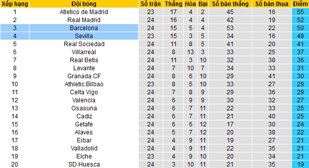 Bảng xếp hạng La Liga trước vòng 25