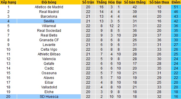 Với 42 điểm có được sau 21 vòng đấu, Sevilla chỉ còn kém đội thứ bà Barcelona đúng 1 điểm đồng thời bỏ xa đội đứng thứ 5 là Villarreal tới 6 điểm.