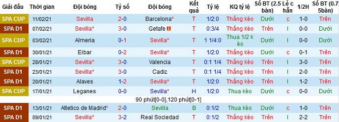 + Thống kê 10 trận gần nhất của Sevilla