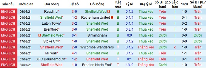 + Thống kê 10 trận gần nhất của Sheffield Wed