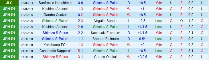 + Thống kê 10 trận gần nhất của Shimizu S-Pulse