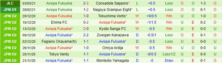 + Thống kê 10 trận gần nhất của Avispa Fukuoka