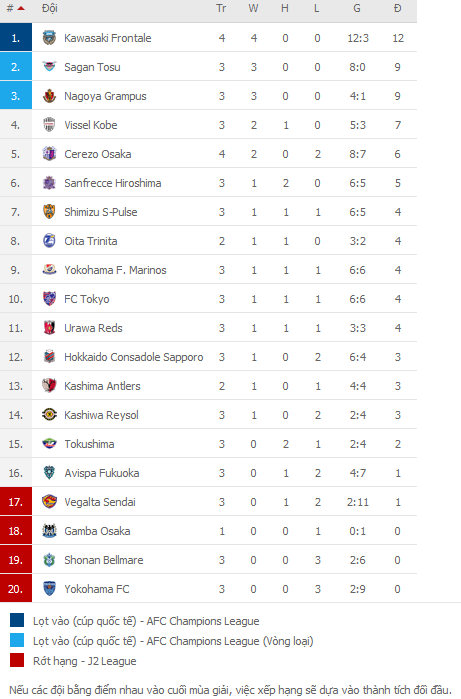BẢNG XẾP HẠNG VĐQG Nhật Bản