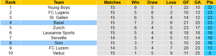Sự ‘nhỉnh hơn’ ấy thể hiện qua thành tích của hai đội. Sion mới thu về 16 điểm sau 15 vòng còn Basel có 23 điểm trong cùng khoảng thời gian.
