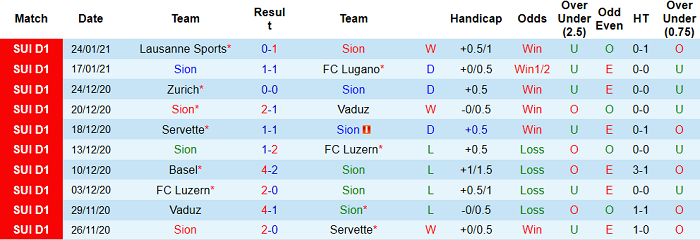 - Thống kê 10 trận gần nhất của Sion