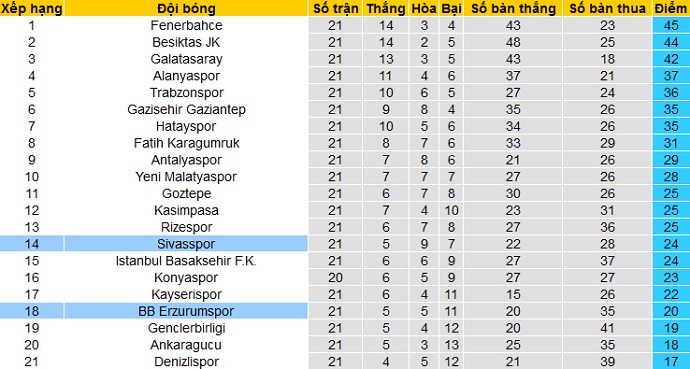 Để thua trong cả 2 vòng đấu gần đây tại giải vô địch Thổ Nhĩ Kỳ nhưng Sivasspor vẫn đang đứng thứ 14 trên bảng xếp hạng với 24 điểm sau 21 vòng đấu. Hiện tại Sivasspor vẫn đang đứng trên nhóm các đội cầm đèn đỏ 4 bậc nhưng với khoảng cách cũng chỉ còn là 4 điểm.