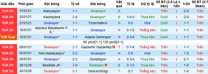+ Thống kê 10 trận gần nhất của Sivasspor