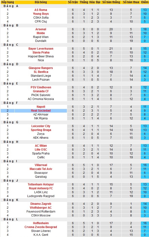 Bảng xếp hạng giai đoạn vòng bảng Europa League