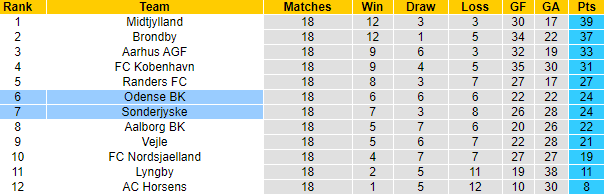 Sonderjyske hiện đứng thứ 7 với 24 điểm, bằng với những gì Odense giành được sau 18 vòng, nhưng Sonderjyske xếp dưới do kém chỉ số phụ. 2 đội đang cạnh tranh quyết liệt cho vị trí thứ 6, và Odense tạm thời chiếm ưu thế nhờ hơn hiệu số bàn thắng/bại.