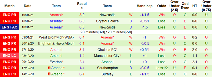 - Thống kê 10 trận gần nhất của Arsenal